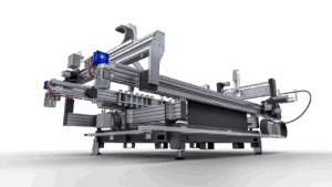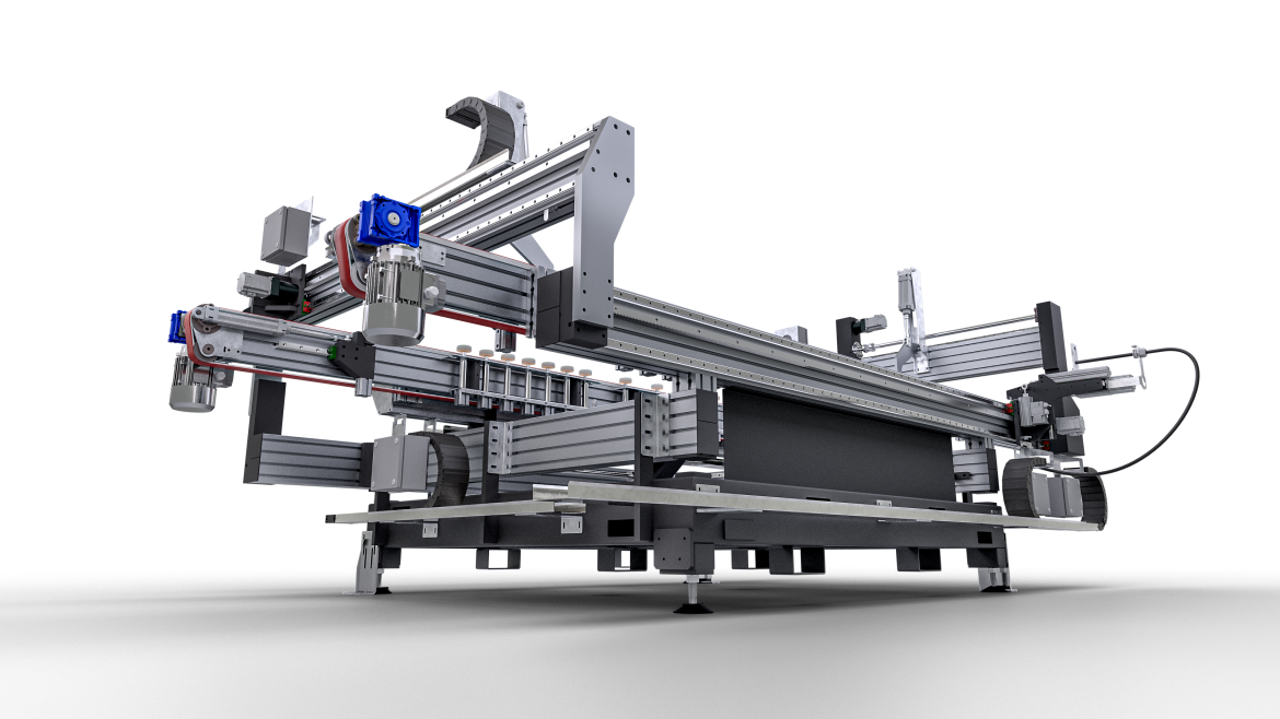 Faz IV: banco per montaggio ferramenta progettato e costruito per eseguire in maniera automatizzata il montaggio e l’avvitatura della ferramenta sulle ante degli infissi in PVC con un’elevatissima velocità di esecuzione, in grado di realizzare un’anta finita ogni 50 secondi circa, in base alle lavorazioni, tipologia di profilo utilizzato e configurazione della macchina.